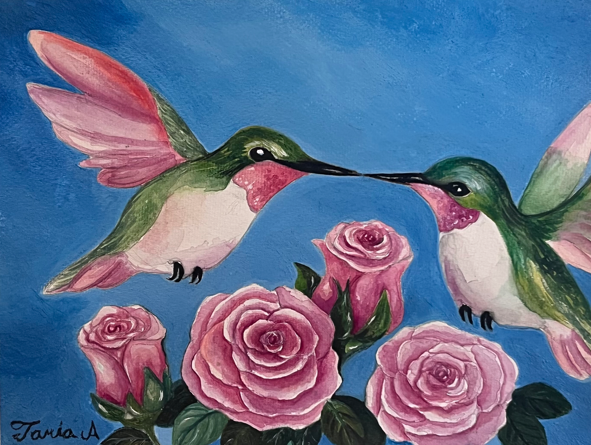 Hummingbirds and Pink Roses