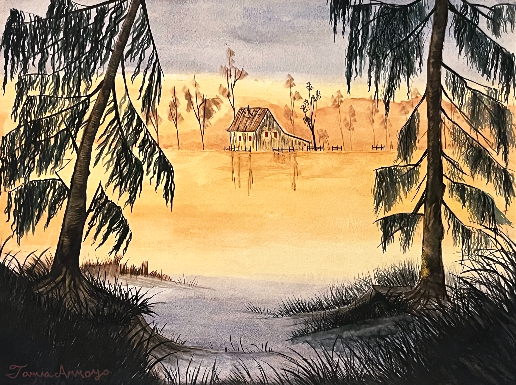 This painting is a Bob Ross-inspired piece featuring two weeping willow trees with a cabin